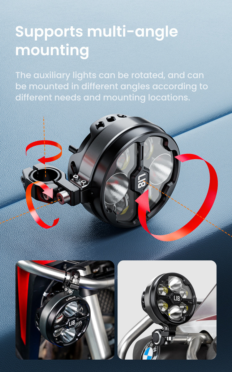 L18S Motorcycle Auxiliary Lights – 23000LM High/Low Beam with 8-Level Brightness & Color Temp Adjustment, 3 Warning Modes, IP68 Waterproof (Pair)